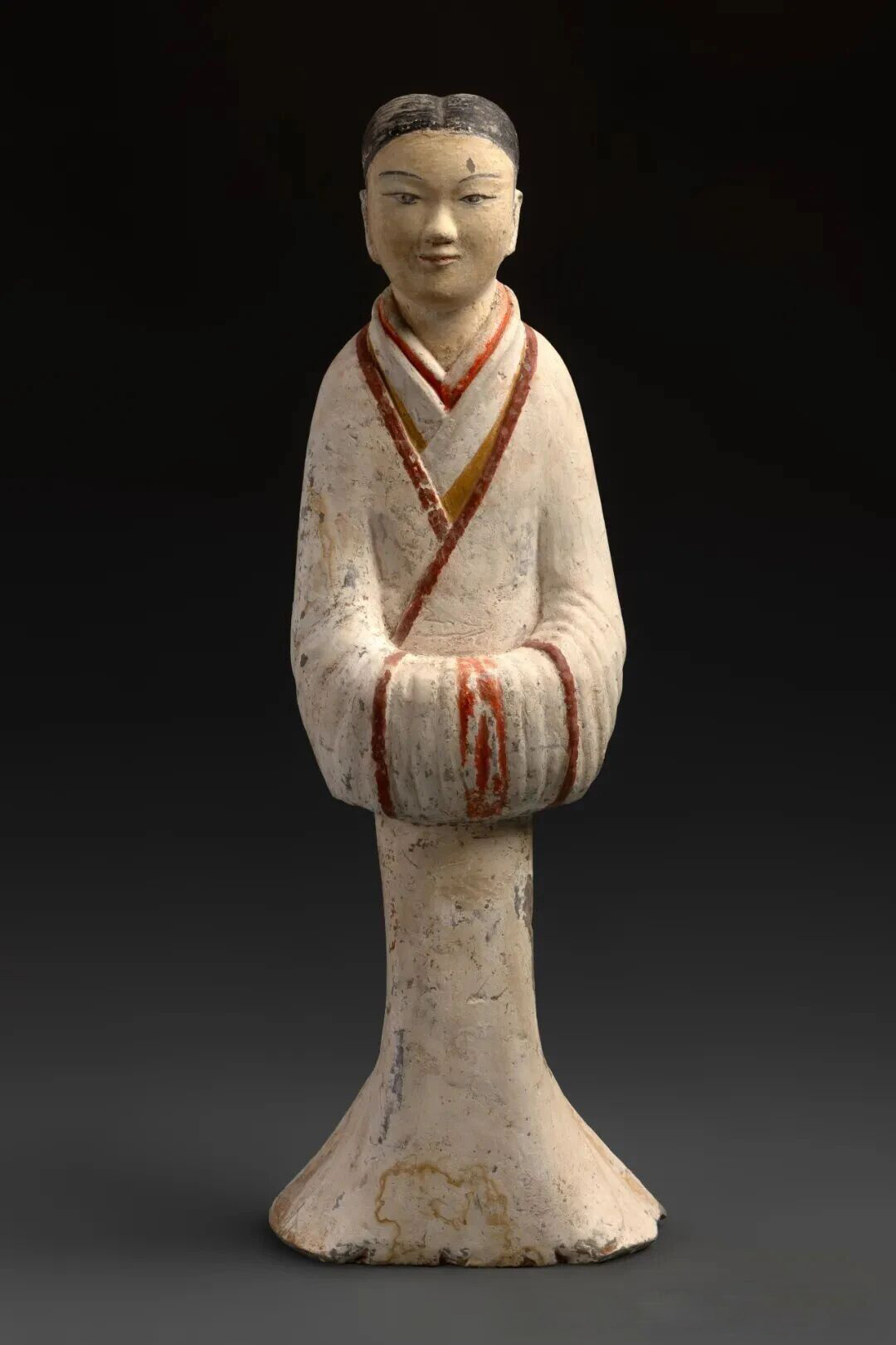 展厅中,两尊塑衣式彩绘侍女俑格外引人注目,来自汉景帝阳陵的她们被观众亲切地称为“大美”和“小美”。杨武站指着这对侍女俑说:“她们是此次来京15件一级文物中的‘颜值担当’,也是阳陵陶俑的艺术典范。”“大美”和“小美”的得名,源于二者体型的直观差异。“大美”通高63厘米,身宽25厘米;“小美”通高53.2厘米,身宽15厘米。虽体型有别,但二者同为汉代典型的塑衣式彩绘侍女俑,是将人俑身体和衣服整体一次模塑成型后再施彩,无需额外装配木质手臂或丝织衣物,堪称汉代陶塑艺术中兼具写实性与审美价值的精品。