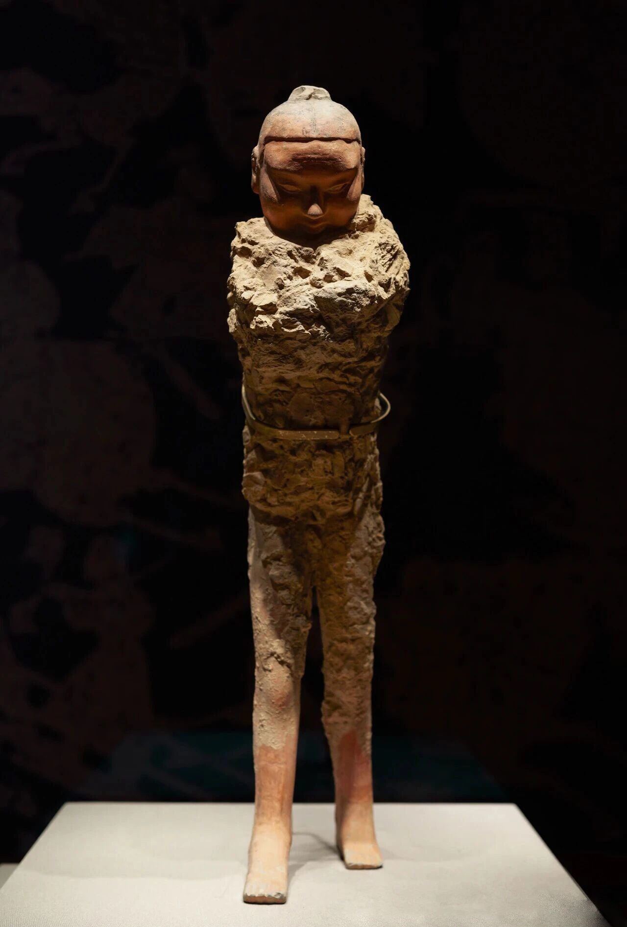 “科学检测显示,陶俑表面残留有纺织品与铠甲痕迹,证实其身穿丝麻衣物,外覆皮质铠甲。”杨武站指出,“铠甲的甲片连接方式承袭秦制,表现为上片压下片、左片压右片,以便于活动。”陶俑上身微向前倾,腰部弯曲,呈行走姿态,似背负重型装备,故被命名为着衣式行走铠甲武士俑。