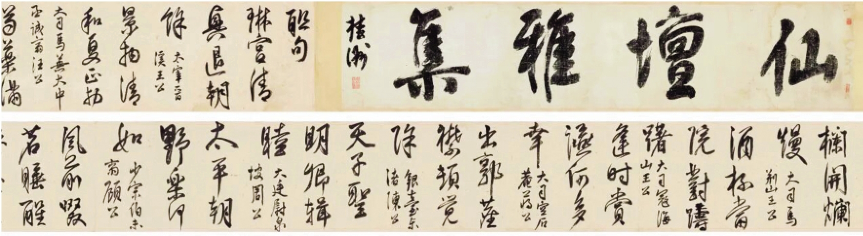 《仙坛雅集诗》卷是嘉靖十一年(1532年)四月初五日,时任礼部尚书的夏言于早朝后邀约同僚至郊外天坛附近赏花,获邀一同前往者,有其余五部尚书及身居要职的股肱之臣。众人赏花赏景之余,又纷纷联句吟咏,盛赞君臣和睦、太平盛世。夏言将这些联句诗书写成卷,并和一首,遂成此长逾十一米巨制《仙坛雅集诗》卷,并自书引首“仙坛雅集”。这一次六部尚书齐聚的雅集,可谓“文人雅集第一”。