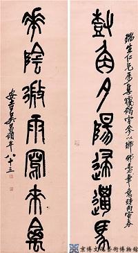 翁同龢,清代重臣、文学家、书法艺术家,咸丰六年(1856年)状元,同治、光绪两代帝师,其文学造诣和艺术修养都极深。书法以颜体为根,又兼学苏轼、米芾,书出新意;晚年得力于北碑,平淡中见精神。此联笔力扛鼎,老辣持重,自有一种雄豪之气在其中。