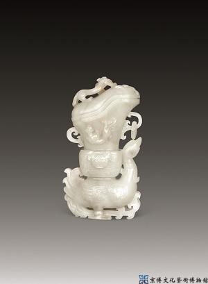 白玉雕鹤鹿同春盖瓶连碧玉座